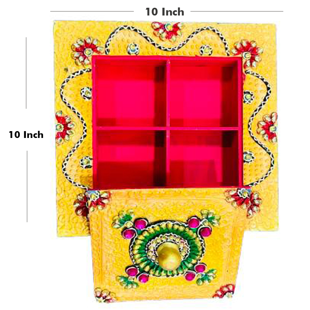 Elevate your festive gifting and home organization with this beautifully handcrafted Wooden Dry Fruit Box. Featuring 4 spacious compartments, this 10×10 inch box is perfect for storing dry fruits, sweets, or snacks. Made with premium wood and finished in vibrant multi-color designs, it adds an ethnic charm to your dining or gifting experience. Ideal for Diwali, weddings, housewarming, and everyday use.